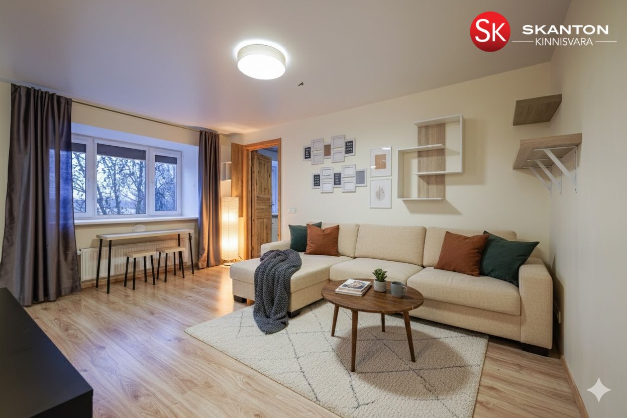 Korter on väga mõnusa ja kompaktse planeeringuga ning osaliselt möbleeritud: köök koos vajaliku tehnikaga (pliit, ahi, õhupuhasti, nõudepesumasin, külmik), söögilaud ja toolid, televiisori aluslaud, magamistoas garderoobikapp. Vannituba koos pesumasinaga.