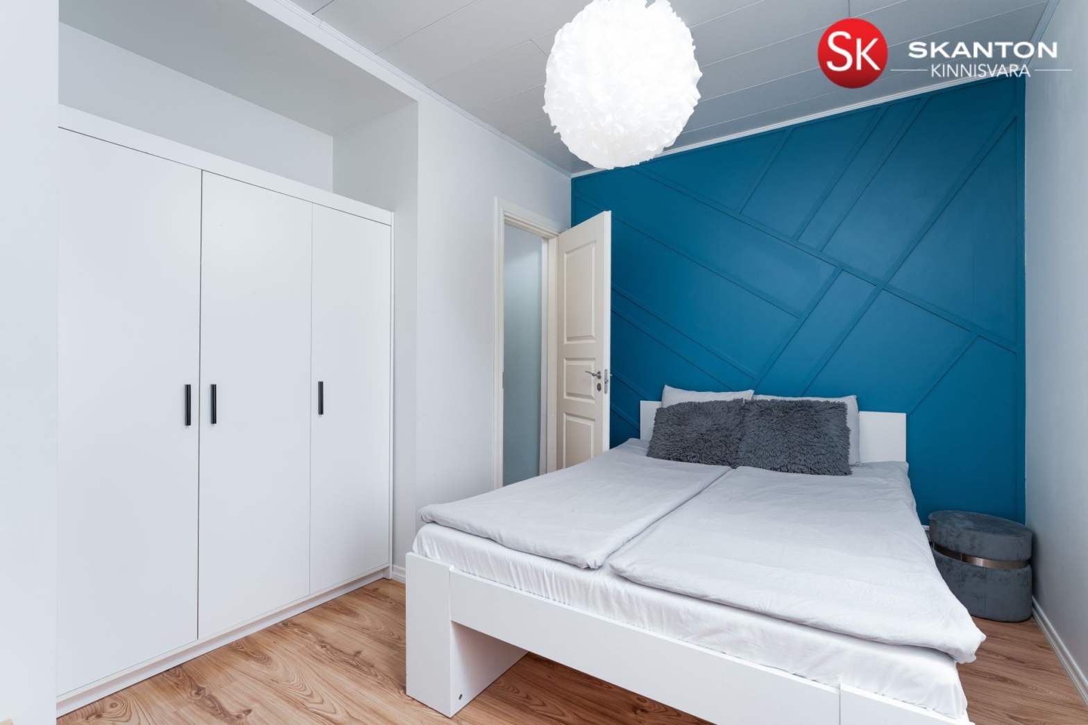 Korteri seinad on valdavalt värvitud heledates ning mahedates toonides. Igas kodus peab olema ka mingisugune „särts“ ja julgemat värvilahendust on kasutatud esiku riidenagi komplektis ning magamistoa tagasein on samuti dekoratiivselt lahendatud.